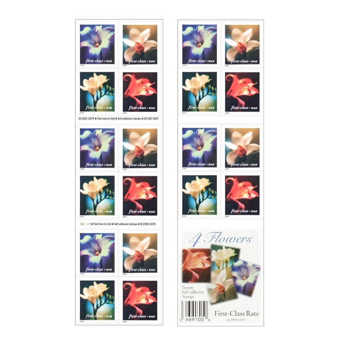 The four flowers photographed on this mint booklet pane are Freesia. Cymbidium Orchid. Longiflorum Lily. and Asian Hybrid Lily. This was the first time photos of flowers were used instead of illustrations. These non-denominated 34 stamps were issued in self-adhesive format in anticipation of the 2001 first class rate increase. Stamps are on both sides of the booklet.