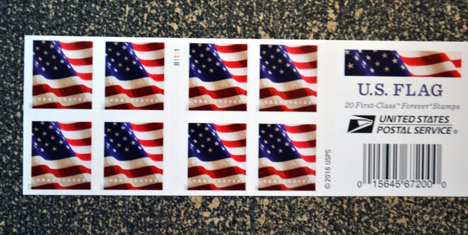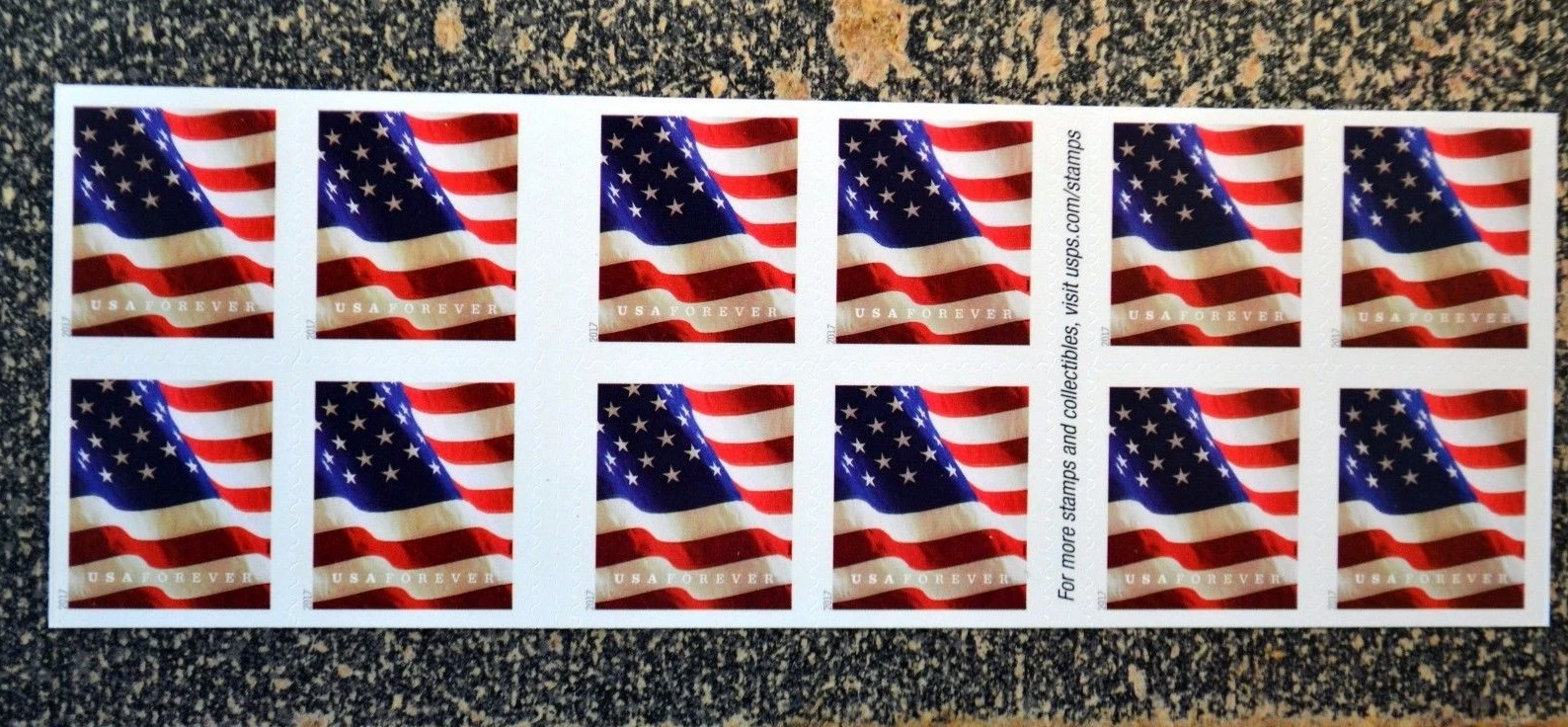 On January 27, 2017, in Norcross, GA, the U.S. Postal Service® issued the U.S. Flag First-Class Mail® stamp (Forever® priced at 49 cents), in one design. The formats available were a pressure-sensitive adhesive (PSA) booklet of 10 stamps (Item 674700) produced by security printer Banknote Corporation of America (BCA), a PSA booklet of 20 stamps (Item 672000) produced by security printers BCA and Ashton Potter (USA) Ltd. (APU), a PSA coil of 100 stamps (Item 749800) produced by security printers BCA and APU, and a PSA Automated Teller Machine (ATM) sheetlet of 18 stamps (Item 564400).