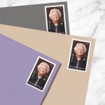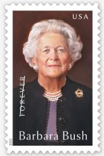 The stamp was designed by Derry Noyes, an art director for USPS, using a detail from the official 2005 White House portrait by artist Chas Fagan. The portrait is part of the White House Collection and appears courtesy of the White House Historical Association. The oil-on-canvas portrait shows Mrs. Bush wearing a purple top, black jacket and one of her signature multi-strand pearl necklaces. “Barbara Bush” is written in white across the bottom of the stamp, with the word “Forever” positioned at the lower-left side and “USA” at the upper-right side.