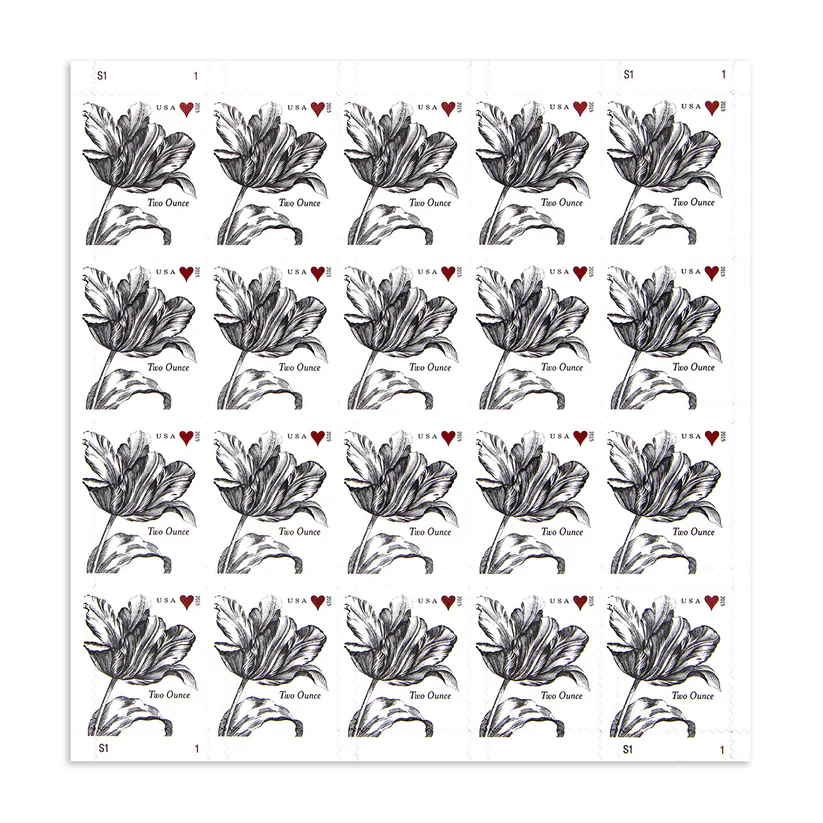 The tulip was chosen for the 2015 Weddings two-ounce stamp because it is a traditional declaration of devotion. This stamp was issued for use on wedding invitations and greeting cards that require extra postage. A coordinating Vintage Rose Forever stamp was also released for use on wedding RSVP cards and thank you notes.